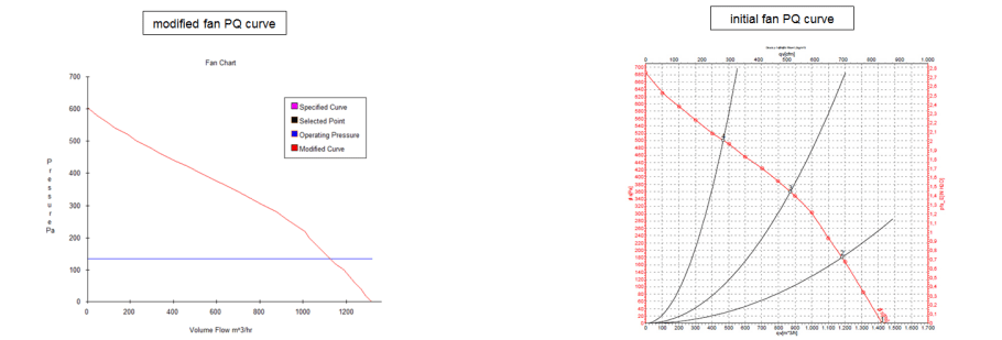 假设系统阻抗80Pa,修正单体通过散热器风机曲线图如下: