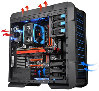 强制风冷是用增加空气的流动作为媒介来实现热源件的冷却需要的散热方式。通过加大热源件的散热表面积和加快单位时间内空气流过物体的速率两种方法能快速的实现良好散热性能。增加散热面积可以在热源件表面加装散热片来实现,一般是把散热片紧贴固定在热源件上以获得更高的散热效能。增加空气流动可用风扇(风机)来加强通风、强化冷却效果。大多数情况下,风扇加上散热片可以使冷却效率大大提高。|